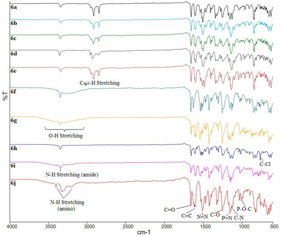 Based on the FTIR spectra overlay of compounds 6a–i (Figure 2), the appearance of the N-H stretching of amide group at 3343 cm−1 confirms the successful reactions of the acid chloride with intermediates 3a–i (Scheme 2).