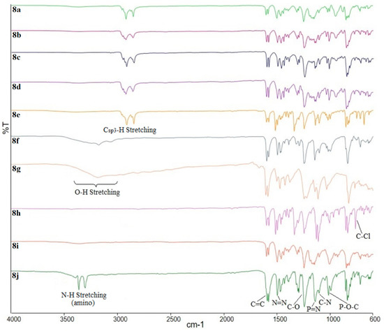 According to the FTIR overlay spectra of compounds 8a–j (Figure 3), the N=N stretching was assigned at 1493 cm−1. The disappearance of the N-H stretching from the starting materials confirmed the formation of N=N bond in the compounds. The alkoxy chains in compounds 8a–e gave the absorptions at 2860 and 2921 cm−1 for the symmetrical and asymmetrical Csp3-H stretching. Meanwhile, the hydroxyl and carboxyl groups in compounds 8f and 8g, respectively, displayed the broad absorption at 3255 cm−1 for the O-H stretching. As shown in the other series, compound 8h with chlorine substituent showed the C-Cl bending at 790 cm−1 while the P=N stretching and P-O-C bending of cyclotriphosphazene ring were observed at 1189 and 997 cm−1, respectively. Only compound 8j showed the N-H stretching which due to the amino (NH2) group as a substituent at the terminal end. The overall FTIR data of compounds 6a–j (Series 1) and 8a–j (Series 2) are summarized in Table 1.