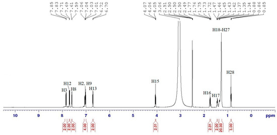 The 1H-NMR spectrum of compound 6e (Figure 5) showed six different sets of doublets at δ 7.84, 7.70, 7.60, 7.05, 7.02, and 6.71 ppm were assigned to the aromatic protons, H3, H12, H9, H2, H13, and H8, respectively. Since the amide group withdrew the electron density of the molecule and resulted in greater deshielding effect, hence H3 was more deshielded compared to H12. The same reasoning applied to H2 with H13 and H8 with H9. However, the signals for H2 and H9 are almost overlapped and observed as two-attached doublets. H13 experienced less deshielding effect since this proton was located far from the amide group. The amide proton cannot be observed as this proton could form a hydrogen bond with the neighbouring atom, causing the signal not noticeable in the spectrum. Meanwhile, a triplet at δ 4.06 ppm belonged to the oxymethylene protons (H15), while all the methylene protons (H16-H27) were observed in the region of δ 1.32–1.77 ppm. Signal of the methyl protons, H28, was observed as a triplet in the most upfield region at δ 0.86 ppm.