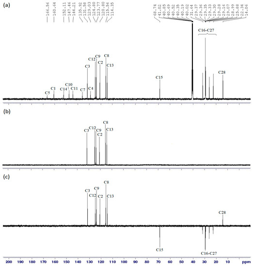 (a) 13C-NMR, (b) DEPT-90, and (c) DEPT-135 spectra of compound 6e.