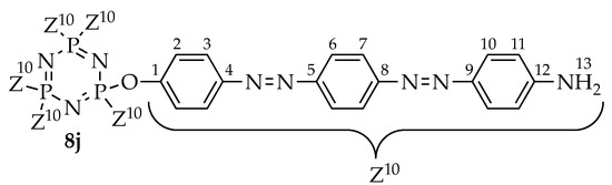 Another hexasubstituted cyclotriphosphazene intermediate, 7 was successfully synthesized from the reaction between HCCP and 4-nitrophenol. The disappearance band at 3320 cm−1 for O-H stretching indicated that 4-nitrophenol was successfully attached to HCCP. This intermediate was then reacted with intermediates 3a–i to form compounds 8a–i with two azo linking units (Series 2). Moreover, compound 8j was synthesized by a different synthetic route. The substitution reaction of HCCP with 4-acetamidophenol in a basic solution yielded hexasubstituted intermediate, 9, which was deprotected to give intermediate 10 bearing an amino group in the side arms. The FTIR spectrum of 9 showed a strong absorption at 3343 (N-H stretching) and 1700 cm−1 (C=O stretching). The disappearance of these two absorptions in intermediate 10, and the appearance of two absorption spikes at 3217 and 3451 cm−1 for the N-H stretching confirmed that the deprotection reaction was successful. Intermediate 10 was reacted with 3i to form compound 8j with the absorption bands at 3217 and 3451 cm−1, confirming that the coupling reactions was successful.