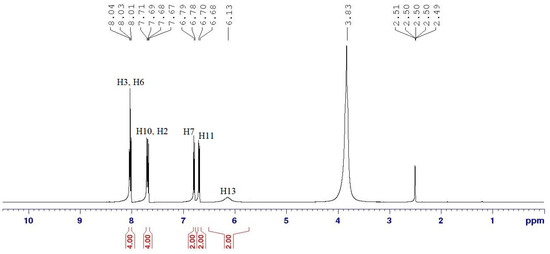 The 1H-NMR spectrum of compound 8j (Figure 8) showed six different signals. Five different sets of aromatic protons were observed at δ 8.03, 7.70, 7.68, 6.79, and 6.69 ppm, which assigned to H3 and H6, H10, H2, H7, and H11, respectively. The assignment of these protons was done by comparing the activation level of the terminal groups. NH2 group was known as an electron donating group and the most active in electron donor substituents. It can donate the electron onto the carbon and few resonance structures can be drawn. As a result, electron density in the nucleus increased and the proton adjacent to NH2 group will be shifted to the most upfield region. Thus, H11 experienced the less deshielding effect compared to the other aromatic protons. Similarly, the signal of H10 was shifted upfield as compared to that of H3, which was more deshielded than H2. Meanwhile, the aromatic protons, H3 and H6 were overlapped and appeared as a triplet since they shared the similar chemical environment. H7 experienced the more shielding effect compared to that of H6 as these protons located near to NH2 group. Furthermore, a broad singlet at δ 6.13 ppm belonged to the amine protons, H13.