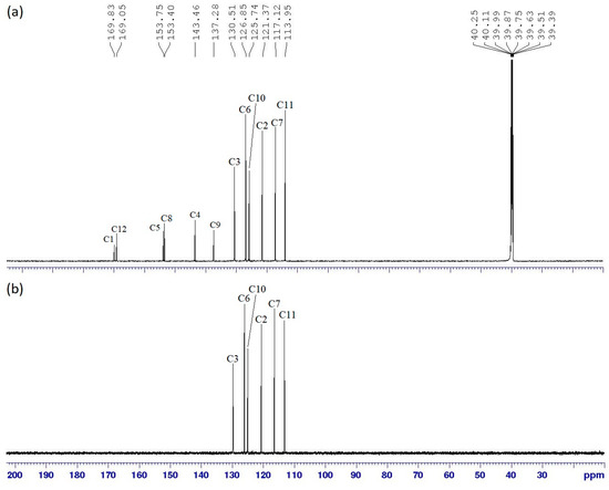 The 13C-NMR spectrum of compound 8j (Figure 9a) showed six different quaternary and aromatic carbons. The aromatic carbons observed at δ 130.51, 126.85, 125.74, 121.37, 117.12, and 113.95 ppm were assigned to C3, C6, C10, C2, C7, and C11, respectively. C1 was located at the most downfield region as this carbon was directly attached to the electronegative oxygen atom. The carbons located at δ 169.83 (C1), 169.05 (C12), 153.75 (C5), 153.40 (C8), 143.46 (C4), and 137.28 (C9), which disappeared in the DEPT-45 spectrum as shown in Figure 9b, were assigned to the quaternary carbons.