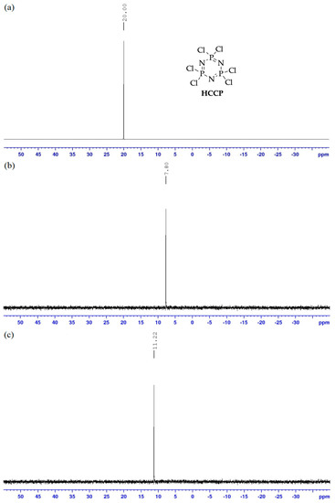 31P-NMR spectrum of (a) HCCP, (b) compound 6e, and (c) compound 8j.