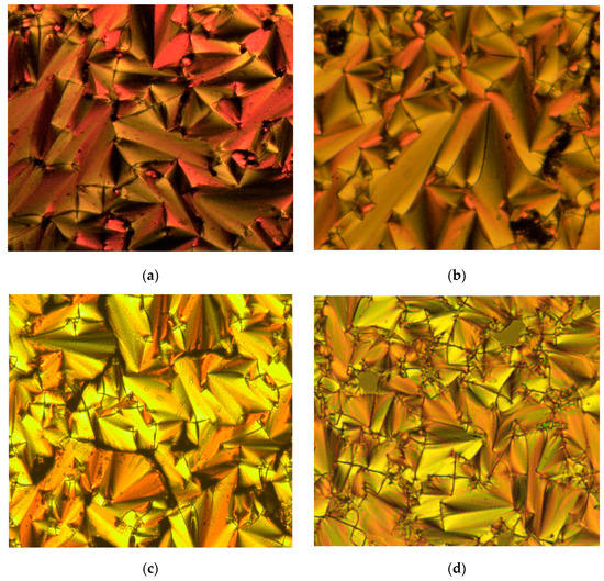 In this study, only intermediates 2a–e with nitro substituent and alkoxy terminal chains showed a smectic A (SmA) phase in the heating and cooling cycles (Figure 11). The compounds in Series 1 with amide and azo linking units that bore a different terminal alkoxy chains are found to be mesogenic with smectic phases. Compounds 6a,b with heptyl and nonyl chains have the texture of focal conic fans of SmA in both cycles (Figure 12). Interestingly, the tendency for the formation of smectic C (SmC) phase increased with an increasing number of aliphatic chains. SmC phase is a tilted analogue of the SmA phase with liquid-like layers, tilted with respect to the layer at angles which vary from compound to compound. Observation under POM (Figure 13) showed that compounds 6c–e exhibited the broken focal-conic fans of SmC phase in both cycles.