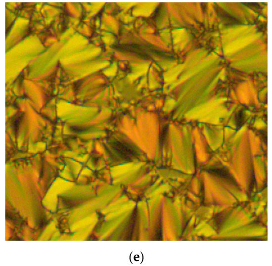 A similar trend is observed for compounds 8a–e (Series 2) having two azo linking units and alkoxy chains at the periphery. These compounds exhibit liquid crystal phase of broken focal-conic fans texture of SmC, as shown in Figure 14. In this works, other intermediates and both series of final compounds having small substituents such as hydroxyl, carboxyl, chloro, nitro, and amino groups in the side arms are found to be non-mesogenic. Only the transition of crystal to isotropic phase was observed in the heating cycle. Similar phase transitions were also observed in the cooling cycle, but in the reversed order form.