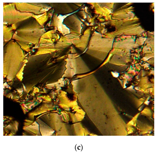 The optical photomicrographs of compounds 6c–e in the heating cycle showed the broken focal conic fans of SmC in the cooling cycle, (a) 150.11 °C for 6c, (b) 144.67 °C for 6d, and (c) 130.55 °C for 6e (Magnification: 20 × 0.25).