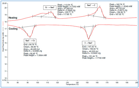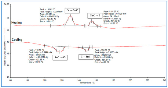 Moreover, the DSC thermograms of compounds 8a–e (Series 2) displayed two peaks in the heating and cooling cycles, which corresponded to the transitions of crystal to SmC and the isotropic phases. For compound 8c (Figure 16), a shoulder in the first curve of the thermogram in the heating cycle indicated the transition of crystal to crystal phase before it was transformed into the SmC phase. However, the formation of crystal to crystal phase did not appear in the cooling cycle as there no shoulder was observed. The melting points for 8a–e were observed at 116.65, 118.42, 113.54, 109.51, and 117.69 °C, while the clearing temperatures at 171.13, 169.24, 162.78, 160.57, and 151.96 °C, respectively. The DSC thermogram of these compounds are provided in the Supplementary Figures S6–S10. All the synthesized compounds exhibited smectic phases, showing a decrease in the melting and clearing temperatures when the alkoxy chain length was increased [25].