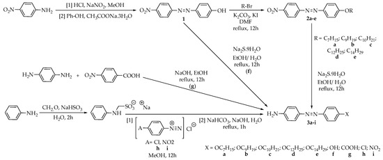 - Uhood, J.A.; Tarik, E.G.; Howraa, H.R. Synthesis and characterization of azo compounds and study of the effect of substituent on their liquid crystalline behaviour. Molecules 2010, 15, 5620–5628. [Google Scholar]