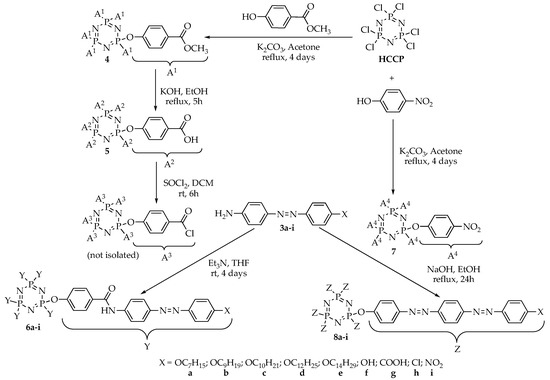 Formation of disk-like intermediates (4, 5, and 7) [37,38] and hexasubstituted cyclotriphosphazene compounds (6a–i and 8a–i) [35,39].