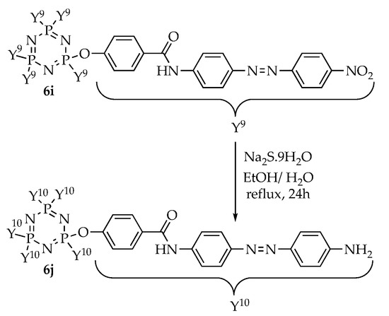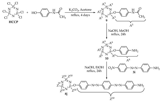 Diazotization reaction of p-nitroaniline with phenol forms 4-(4-nitrophenylazo)phenol, 1, which is alkylated with heptyl, nonyl, decyl, dodecyl, or tetradecyl bromide to give a series of nitro intermediates, 2a–e. Reduction of 2a–e or 1 gives the subsequent amine, 3a–f. Another similar reaction with a series of substituted aniline results in 3g–i. As a result of the reaction of hexachlorocyclotriphosphazene, HCCP, with methyl 4-hydroxybenzoate, the hexasubstituted cyclotriphosphazene benzoate, 4 is formed, which was then hydrolyzed to give the subsequent benzoic acid, 5. Further reaction of 5 with 3a–i produces the first series of hexasubstituted cyclotriphosphazene derivatives with amide and azo linking units, 6a–i. Meanwhile, compound 6j is formed by means of the reduction of 6i. Another reaction of HCCP with 4-nitrophenol gives intermediate 7, which further reacts with 3a–i to form the second series of hexasubstituted cyclotriphosphazene derivatives with two azo linking units, 8a–i. Intermediate 9 was produced from the reaction of HCCP with 4-acetamidophenol, and then deprotected to form intermediate 10. Lastly, compound 8j was synthesized by the reaction of intermediate 10 with 3i with amino terminal end. The general synthesis method for these intermediates and final compounds are described in Scheme 1, Scheme 2, Scheme 3 and Scheme 4.
