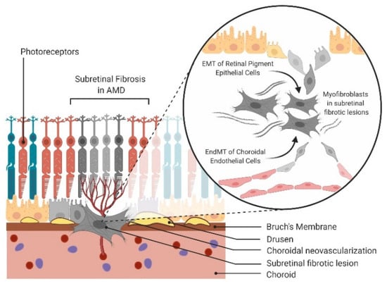 Predominant in subretinal fibrotic lesions are myofibroblasts, which are not normally present in adult tissues and thus, their cellular origins remain an ongoing debate. Extensive literature supports the role of epithelial–mesenchymal transition (EMT) in myofibroblast production [3]. In the context of AMD, retinal pigment epithelial (RPE) cells lose their cell–cell adhesions and apical–basal polarity, transforming into mesenchymal cells through EMT [4]. Another emerging hypothesis is the role of endothelial–mesenchymal transition (EndMT) in contributing to the mesenchymal cell population [5]. In neovascular AMD (nAMD), angiogenesis initiates inflammatory cell recruitment and increases oxygen supply and nutrients to the macular region [6]. Neovessels sprouting from either the choroid or the deep retinal vessels form choroidal neovascular membranes (CNV) or intraretinal angiomatous proliferative lesions, respectively. EndMT of choroidal endothelial cells (CECs) or retinal endothelial cells could contribute to the mesenchymal cell population in subretinal fibrotic lesions. These leaky neovessels also contribute to retinal edema, hemorrhage and further potentiate the pathological wound healing response.