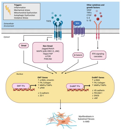 Signaling pathways and mechanistic drivers of epithelial-mesenchymal transition (EMT) and endothelial-mesenchymal transition (EndMT) in age-related macular degeneration (AMD). Various extracellular cytokines and receptor tyrosine kinase (RTK) signaling pathways are involved in activating EMT of retinal pigment epithelial cells and EndMT of choroidal endothelial cells. TGFβ is the master regulator and activates both the canonical Smad signaling pathway and a host of non-canonical signaling pathways. The Wnt/β-catenin signaling pathway also plays a key role in both EMT and EndMT. Activation of EMT and EndMT results in the upregulation of various transcription factors (TFs) such as Snai1 and mesenchymal genes and the downregulation of epithelial or endothelial genes, respectively. This ultimately leads to myofibroblast transdifferentiation and excessive extracellular matrix deposition observed in subretinal fibrotic lesions in AMD.