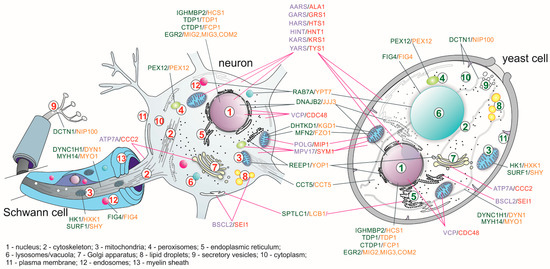 Scheme showing the localization of selected proteins, in which mutations have been associated with hereditary peripheral neuropathies in a human nerve cell and a yeast Saccharomyces cerevisiae cell. The violet color indicates human proteins complementing mutations in yeast proteins, marked in red; green indicates human proteins possessing orthologs in yeast S. cerevisiae that are marked orange.