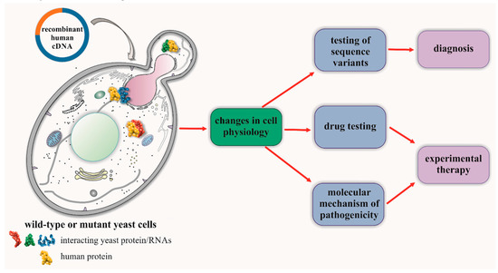 Yeast as a system to evaluate functional effects of human genetic variations. The coding part of a human gene (cDNA) is inserted under a yeast regulatory sequence and transformed into yeast cells, where it is expressed. The resulting protein interacts with yeast cellular components (proteins, RNAs, lipids, etc.) and affects the cell physiology, leading to the selected phenotypes which may be monitored. The system presented may be used to test unknown sequence variants to improve diagnosis, or for screening drug candidates and investigating the molecular mechanisms of pathogenicity to develop future experimental therapies.