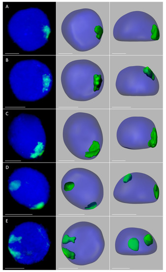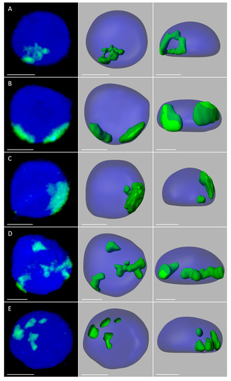 - Hepperger, C.; Mannes, A.; Merz, J.; Peters, J.; Dietzel, S. Three-dimensional positioning of genes in mouse cell nuclei. Chromosoma 2008, 117, 535–551. [Google Scholar] [CrossRef][Green Version]