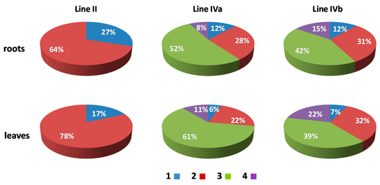 The association frequencies of added maize chromosomes in the root and leaf nuclei of OMA lines with two (line II) and four (lines IVa and IVb) chromosome additions. Blue (1): one area containing maize chromatin (total association of maize CTs); red (2): two areas containing maize chromatin; green (3): three areas; purple (4): four areas (total separation of maize CTs).