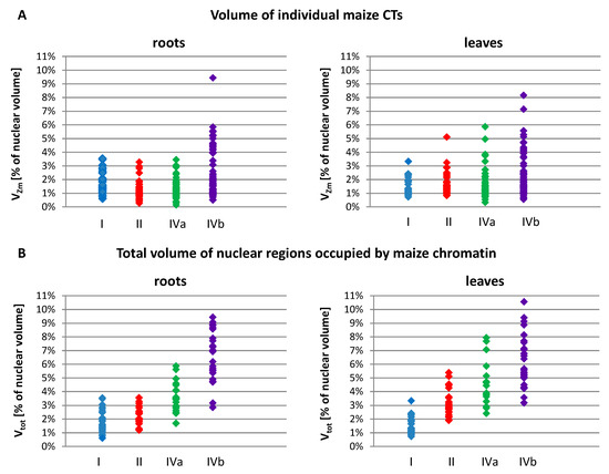 The total sum of the volumes of all maize CTs present in the nucleus (Vtot) increased, as could be expected, with the increasing number of maize chromosomes added to the oat genome (Figure 5B). Nevertheless, there were striking differences between the two lines with four maize chromosomes. In line IVa, the average values (Vtot_av) equaled 3.47% in root nuclei and 4.56% in leaf nuclei, whereas in line IVb the maize chromatin occupied on average 6.53% and 6.15% of the nuclear volume in roots and leaves, respectively. The minimal and maximal values of Vtot were also higher for line IVb in both types of tissue. This observation indicates that, beside the number of added chromosomes, the type of chromosome also plays a role in determining the amount of space that is taken up by the introgressed chromatin in the host nucleus.