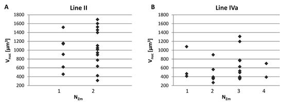 We analyzed possible correlations between the number of areas formed by the maize CTs inside the nucleus (NZm), the nucleus size (Vnuc), and the total volume of maize chromatin (Vtot). The assessment of the relationship between the Vnuc and NZm indicated that the maize chromosomes may form various associations regardless of the nucleus size, as shown by representative charts presented in Figure 6. The low values of the Spearman’s rank correlation coefficients calculated for Vnuc and NZm confirmed the hypothesis that the number of regions occupied by maize chromatin does not depend on the nuclear volume. Analogous analyses showed that there is no correlation between NZm and Vtot. This means that the total volume that the maize CTs occupy in the hybrid nucleus varies within the same range, regardless of their association pattern (Figure A1).