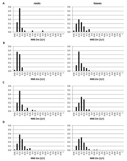 The probability distribution of nearest nuclear edge (NNE-Zm) distances in the root and leaf nuclei. (A) line I; (B) line II; (C) line IVa; (D) line IVb. The NNE-Zm distances were normalized by the cube root of nuclear volume, which allowed for analyzing them as fractions of the nuclear radius r.