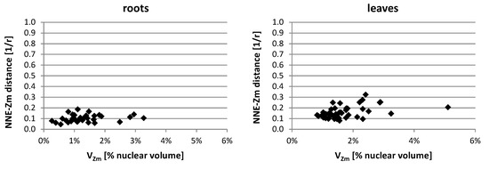 In the lines with more than one added maize chromosome, the influence of the maize chromosome associations on the NNE-Zm values was also evaluated. The analysis of probability distributions, when they were calculated separately for nuclei with differing NZm (data not shown), indicated that the number of maize chromatin-occupied regions in a nucleus did not play a role in determining their position. Additionally, the average NNE-Zm distances calculated for nuclei with varying number of maize chromatin regions did not correlate with that number. Likewise, no correlation was found between the size of a region occupied by maize chromatin (VZm) and its distance from the nuclear edge (Figure 8).
