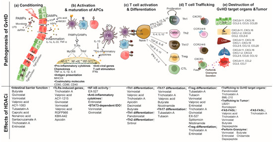 Overview of the histone deacetylases (HDAC) inhibitors on graft-versus-host disease (GvHD) pathogenesis. The pathogenesis of GvHD in sequential steps; (a) conditioning regimen; (b) activation and maturation of the antigen-presenting cells (APCs); (c) donor T cell activation, expansion, differentiation; (d) trafficking of donor T cells; (e) destruction of GvHD target organs. In the bottom panel, various HDAC inhibitors are listed for each stage of the GvHD pathogenesis. Some of the inhibitors such as trichostatin A and entinostat have contradictory effects on GvHD pathogenesis, particularly in the regulation of Treg cell differentiation. It is assumed that these dual effects might be derived from different types of GvHD models, and dosage and timing of inhibitors.