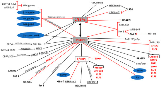 Signalling pathways such as the canonical Wnt/β-catenin, Hedgehog and transforming growth factor beta (TGF-β) 1 and 2, as well as Sirtuin (Sirt) 1, microRNA (MiR)-27a and MiR-93, inhibit PPARγ and C/EBPα expression. Conversely, the glucocorticoid, cAMP, and bone morphogenetic proteins (BMPs) signalling as well as methyltransferase mixed lineage leukaemia protein 3/4 (MLL3/4) polycomb repressive complex 2 (PRC2) and enhancer of zeste homolog 2 (Ezh2), MiR-210 (MiR-210), bromodomain-containing protein 4 (BRD4), Sirt 7 and MiR-146 promote PPARγ and C/EBPα expression. H3K9me2 and HDAC9 directly inhibit C/EBPα expression while H3K27me3 and H3K4me2 directly promote it. LSD1 promotes and inhibits C/EBPα expression indirectly through H3K4me2 and H3K9me2, respectively. H3K9, H3K18, H3K27, coactivator-associated arginine methyltransferase 1 (CARM1), ten eleven translocation (Tet) 2, C/EBPβ, C/EBPδ, signal transducers and activators of transcription (STAT)5, early B-cell factor 1 (EBF1), sex determining region y-box (SOX) 6, kruppel-like factors (KLF) 5, 6 and 9, MiR125p-5p, switch/sucrose nonfermenting family (SWI/SNF), and protein arginine methyltransferases (PRMT) 5 directly promote PPARγ expression, while general control non-depressible 5 (Gcn5) and p300/CREB-binding protein (CBP)-associated factor (PCAF), CBP/p300, H3K4me3, H3K9/K14, Krox20, zinc finger factor 638 (ZNF638), KLF4, and KLF9 are the indirect promoters of PPARγ expression. Forkhead box protein O1 (FOXO1), DNA methyl transferase (Dnmt) 1, GATA2, KLF2 and MiR-130 directly inhibit PPARγ expression while Sirt 2, G9a and H3K9me2 and SOX9 are the indirect inhibitors of PPARγ expression. PPARγ or C/EBPα transactivate each other.