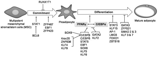 The process of adipogenesis has been extensively studied and decades of research have reported over a dozen transcription factors to be involved in regulating this process, both in vitro and in vivo [146,147] (Figure 2). The transcription factor Zfp423 plays an essential role in regulating MSC commitment to preadipocytes and its expression remains unchanged during adipogenesis [148,149]. Ectopic expression of Zfp423 in non-adipogenic NIH-3T3 fibroblasts activates PPARγ expression in undifferentiated cells, which allows them to undergo adipogenesis, hence suggesting that Zfp423 is an important transcriptional regulator of preadipocyte determination [149]. Zinc finger protein B-cell lymphoma 6 (Bcl6) promotes preadipocyte commitment and differentiation in vitro and ex vivo, such that Bcl6 knockdown in C3H10T1/2 cells suppresses their adipogenic potential while its overexpression enhances adipogenesis by activating STAT1 downstream. Impaired adipogenic commitment and differentiation of Bcl6 knockdown C3H10T1/2 cells was rescued by STAT1 overexpression, making STAT1 a direct downstream target of Bcl6 [150]. Intra-tibial injection of cells transduced with Zfp467 into C57Bl/6 mice doubles the number of adipocytes found in the bone marrow compared to vector control-transduced cells, suggesting a potential role for Zfp467 in the commitment of precursor cells to the adipogenic lineage [151]. Early B-cell factor 1 plays a role in adipogenic lineage commitment in mice as shown by the lack of adipocyte precursor cells in Ebf1 null mice [152]. Overexpression of Ebf1 in fibroblasts promotes adipogenic differentiation through the direct activation of the PPARγ promoter [147,153]. STAT5 promotes adipogenesis in vitro and in vivo in murine and human preadipocyte and non-precursor cells [147,154,155,156,157]. Studies in both 3T3-L1 cells and C3H10T1/2 cells show that STAT5 promotes adipogenesis by inducing PPARγ expression [158]. Nude mice injected with a vector expressing STAT5A developed adipose tissue at the site of injection after 6 weeks, while mice receiving control vector failed to develop adipose tissue, suggesting STAT5A promotes adipocyte development [159]. RUNX1 inhibits C3H10T1/2 cell commitment to preadipocytes and its expression in BMP4-treated cells was found to be very low. Forced expression of RUNX1 in BMP4-treated C3H10T1/2 cells inhibited their commitment to the adipocyte lineage, which suggests that downregulation of RUNX1 is needed for C3H10T1/2 adipocyte commitment [160].