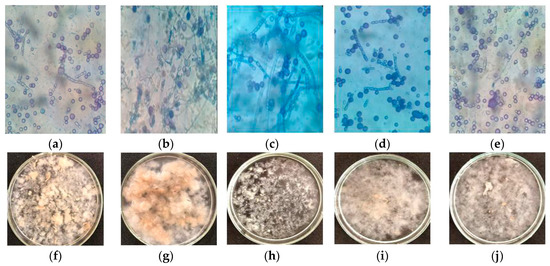 Morphological aspects of Mucor subtilissimus UCP 1262 cultivated in different concentrations of CSL and CWW according to 22 factorial design for 120 h. (a,f): Assay 1; (b,g): assay 2; (c,h): assay 3; (d,i): assay 4; (e,j): center point. Assay 1: 2% CSL and 4% CWW; assay 2: 6% CSL and 4% CWW; assay 3: 2% CSL and 8% CWW; assay 4: 6% CSL and 8% CWW; center point: 4% CSL and 6% CWW. Bars: 10 μm.
