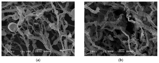 Ultrastructural aspects of biomasses with higher chitosan yields were also observed by scanning electron microscopy. Figure 3 shows the mycelial branches of the Mucor subtilissimus (UCP 1262) (6% CSL/4% CWW) with loose mycelium and hyphae with a thickness that was thinner, tubular, contorted, and with morphological aspect of yeast cells (Figure 3a) and Lichtheimia hyalospora (UCP 1266) (assay central point: 4% CSL/6% CWW) with compact mycelium hyphae with a thickness that was thinner, tubular and contorted. (Figure 3b). This study suggests that L. hyalospora (UCP 1266) mycelium fragmentation is a result of pellet formation. As other genera of the order Mucorales, they grow rapidly and have tubular-shaped hyphae and no septation. Liao et al. [44] observed morphological aspects of Rhizopus oryzae by SEM grown in agroindustrial wastes (soybean meal, wheat, and rice) to understand the relationship between morphology and production of glycosamine, lipids, and amino acids. According to [45], the culture medium composition and culture conditions influence the metabolic regulation and, consequently, the morphology. The increase in biomass and chitosan is a reliable indicator of the development of the studied fungi.