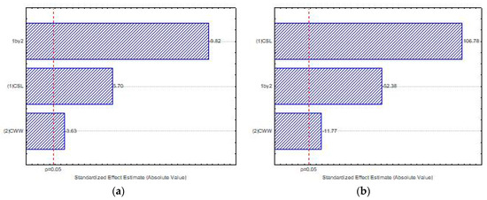 Figure 4 presents the influence of the independent variables, corn steep liquor—CSL (1) and cassava waste water-CWW (2), and the interaction between these variables (1 × 2) on biomass production by Mucor subtilissimus (UCP 1262) and Lichtheimia hyalospora (UCP 1266), using factorial design, with statistical significance of p < 0.05. The Pareto chart illustrates that the increase in the concentration of CSL (1) positively influenced the growth of the microorganisms. However, lower levels of CWW (2) were suggested for biomass production (Figure 4a,b). The interaction of the independent variables (1 × 2) showed that the maximum level of CSL (1) and the minimum level of CWW (2) had an antagonistic interaction, with significant influence on the biomass production in both microorganisms (Figure 4a,b).