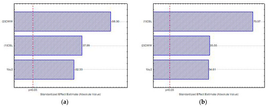 The Pareto (Figure 5b) shows that higher concentrations of both independent variables—CSL and CWW—exhibited a significant influence on the chitosan production by L. hyalospora (UCP 1266). Consequently, the interaction of the variables (1 × 2) was significant, suggesting that the synergic effect of these substrates stimulated the biopolymer production.