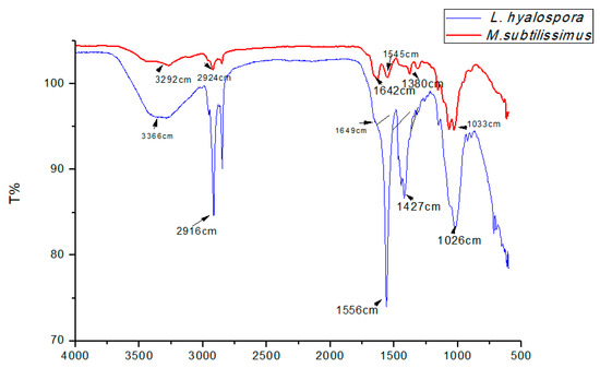 The viscosity of chitosan of M. subtilissimus (UCP 1262) (3.06 cP) was considerably higher that the of L. hyalospora (UCP 1266) (2.78 cP). Similar results were obtained in studies of the viscosity of fungal chitosan, where the viscosity of fungal chitosan ranged from 1.02 to 2.67 cP [52,53,54]. The commercial chitosan, extracted from natural shellfish exoskeleton, may have a deacetylation degree of 80.0–95.0% and viscosity of 20–500 cP [54].