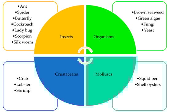 Chitin is widely distributed in nature and is the main element of the marine invertebrate exoskeleton and can be found in the structure of insects, arthropods, and molluscs [24,25,26]. Figure 2 presents the main sources of chitin production and its extraction.