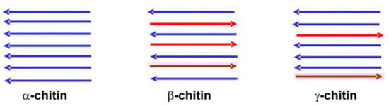 Chitin polymorphism can be visualized using X-ray diffraction, where three crystalline structures are observed, α, β, and γ, which differ by the number of chains per cell, degree of hydration, and unit size. The α-chitin is the most abundant form, being found in arthropod exoskeletons, where the dispositions of the polymeric chains are antiparallel, which favors the existence of numerous inter- and intra-chain hydrogen bonds that result in a densely packed material (Figure 3). In β-chitin, the disposition is parallel and they are found in animals that show flexibility and resistance, such as squids. The γ-chitin displays a mixture of both positions [27,28].