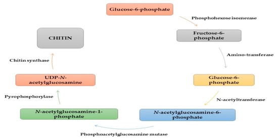 Generally, the carbon source used for chitin synthesis is glucose, starting the process of glycogen catalysis by the enzyme phosphorylase and being converted into glucose-1-P. In the presence of phosphomutase, glucose-6-P is formed and further converted to fructose-6-P by hexokinase. Intracellular fructose-6-P is converted to glucosamine-6-P via aminotransferase using L-glutamine. Then, glucosamine-6-P is converted to N-acetylglucosamine-6-P via N-acetyltransferase using acetyl co-A as a substrate. The phosphate group on it is changed from the 6-P to the 1-P position by phosphoacetylglucosamine mutase. Subsequently, N-acetylglucosamine-1-P is converted to UDP-N- acetylglucosamine via pyrophosphorylase using triphosphate as the cosubstrate. Chitin is formed from UDP-N-acetylglucosamine in the presence of the enzyme chitin synthase (Figure 4) [32,33,34]. The chitin deacetylation reaction results in chitosan [35,36].