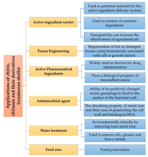 Chitin derivatives have high economic value due to their biological activities and applications, being biodegradable and biocompatible polymers as well as produced by renewable natural sources. Harnessing the by-products of crustacean processing is a profitable activity because of their richness in high value-added compounds [29,30].