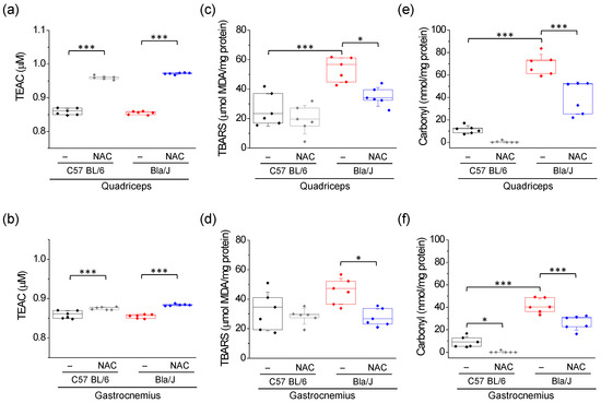 Carbonyl levels were significantly higher in both quadriceps and gastrocnemius of Bla/J mice, and NAC treatment reduced this protein oxidation marker in both muscles, but not to levels of NAC treated C57 BL/6 mice (p < 0.001; Figure 1e,f). NAC also significantly reduced carbonyl levels in gastrocnemius of C57 BL/6 mice. Data (means ± SD) of these results are shown in Table S1.