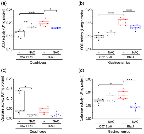 As shown in Figure 2a,b, SOD activity is significantly increased in both quadriceps and gastrocnemius muscles of Bla/J mice, as compared with those of C57 BL/6 mice (see means ± SD in Table S1). NAC supplementation significantly reduced SOD activity in both muscles, although the activity level of this enzyme in gastrocnemius did not reach that observed in NAC treated C57 BL/6 mice (p < 0.001; Figure 2b). NAC treatment also increased SOD activity in quadriceps, but not in gastrocnemius of C57 BL/6 mice (Table S1).