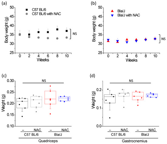 We also compared wet mass of isolated quadriceps and gastrocnemius muscles (Figure 3c,d). In C57 BL/6 mice with or without NAC supplementation, quadriceps weights were 0.20 ± 0.03 g and 0.21 ± 0.03 g (means ± SD), respectively. In Bla/J mice with or without NAC supplementation, quadriceps weights were 0.22 ± 0.04 g and 0.22 ± 0.01 g, respectively. In the absence of NAC supplementation, gastrocnemius weights were 0.14 ± 0.05 g and 0.16 ± 0.03 g in C57 BL/6 and Bla/J mice, respectively. After NAC supplementation, gastrocnemius weights were 0.17 ± 0.03 g and 0.17 ± 0.01 g in C57 BL/6 and Bla/J mice, respectively. No significant differences were found between wet mass of isolated muscles from C57 BL/6 and Bla/J mice, either with or without NAC supplementation (Figure 3b,c).