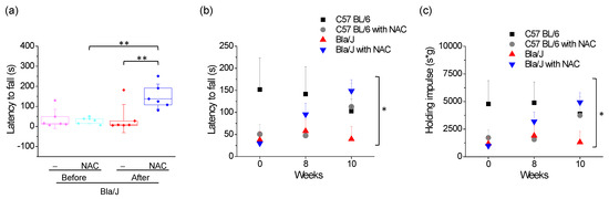 Effect of NAC on grip strength in dysferlin-deficient Bla/J mice. Grip strength was measured using the Kondziela’s inverted screen test. Panel (a) Boxes indicate 25-75 percentiles of latency to fall, lines within boxes indicate medians, and whiskers indicate SD. Each dot represents an individual sample (six mice per group). ** p < 0.01 (one-way ANOVA followed by Tukey-Kramer multiple comparisons test). Panels (b,c) compare latency to fall (b) and holding impulse (c), calculated by multiplying latency to fall by body mass, in the four groups before NAC supplementation (week 0), at week eight, and at the end of treatment (week 10). Data show mean ± SE. Two-way ANOVA with repeated measures revealed a significant interaction between NAC treatment and measurement time in latency to fall (F(1.60, 31.95) = 4.53, p = 0.025; η2 = 0.034) and in holding impulse (F(1.67, 33.39) = 3.60, p = 0.046, η2 = 0.059).
