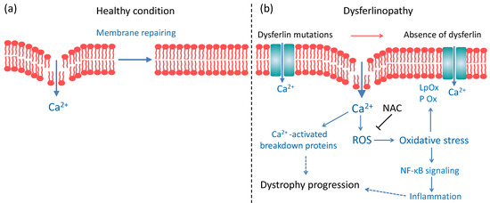Scheme of mechanisms that might contribute to the dystrophy progression in dysferlinopathies. (a) In a healthy condition, the damage in plasma membrane is rapidly repaired, and only a local increase of Ca2+ is produced. (b) In a dysferlinopathy condition, the membrane repair is impaired [6], and non-selective channels, such as connexin-based hemichannels, P2X7 receptors and transient receptor potential TRPV2 channels are de novo expressed [56,57]. This could contribute to an altered Ca2+ homeostasis [56], mitochondrial dysfunction [12], ROS production [13], and consequently OS, resulting in lipid peroxidation (LpOx) and protein oxidation (P Ox) [4]. OS further conduces to the activation of the NF-κB inflammatory signaling pathway [58]. On the other hand, an altered Ca2+ homeostasis might also lead to the activation of breakdown protein pathways such as calpains, ubiquitin-proteasome pathway and autophagy [59], whose overactivation also results muscle atrophy [60]. NAC reduces OS and NF-κB inflammatory signaling pathway [61].