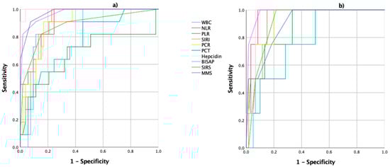 ROC curves of WBC: white blood count; NLR: neutrophil/lymphocyte ratio, SIRI: systemic inflammatory response index; PLR: platelet/lymphocyte ratio; CRP: C-reactive protein; PCT: procalcitonin; hepcidin; BISAP: bedside index of severity in acute pancreatitis; SIRS: systemic inflammatory response syndrome; and the MMS: modified Marshall score, at 48 h of symptom onset; (a) the ROC curves for the prediction of acute biliary pancreatitis severity; (b) the ROC curves for the prediction of acute biliary pancreatitis mortality.