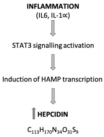 Hepcidin was first described by Krause et al. [], termed as liver-expressed antimicrobial peptide (LEAP-1) with antimicrobial activity. In 2001, Park et al. [] identified it in urine and renamed it as hepcidin. Hepcidin is a peptide hormone with 25 amino acids, responsible for the regulation of the hemostasis of iron. The hepcidin gene (hepcidin antimicrobial peptide (HAMP)) is located on chromosome 19 []. The main source of the synthesis of hepcidin is the liver. Extra-hepatic production of hepcidin was described in the heart, kidney, retina, monocytes and macrophages, alveolar cells, adipocytes, pancreatic β-cells and bile [,,]. The hepcidin levels increase during inflammation, primarily as a result of increased IL-6 and IL-1 [,] levels by activating the signal transducer and activator of transcription-3 (STAT3) signaling to hepcidin gene promoter (Figure 3).