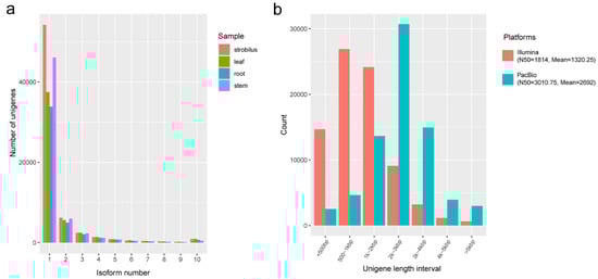 (a) Distribution of isoform numbers for unigenes in four organs of P. chienii; (b) comparison of unigene length distribution using different sequencing platforms.