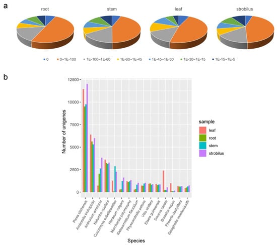 The sequences were compared to those of homologous species by aligning the unigenes using information in the Nr database. The top three homologous species in the root, stem, and leaf were all distributed in Picea sitchensis (9507, 9751, and 11,443 unigenes), Amborella trichopoda (5622, 5296, and 6392 unigenes), and Nelumbo nucifera (3231, 3124, and 3601 unigenes). In the strobilus, the top three homologous species were P. sitchensis (12,019 unigenes), A. trichopoda (5995 unigenes), and Anthurium amnicola (3825 unigenes) (Figure 2). Unsurprisingly, the top homologous species was a conifer. The E-value distribution showed that most of the unigenes shared higher homology with their hits from homologous species (E-value < 1 × 10−100), and that the distribution patterns of E-values were generally similar among the four organs (Figure 2a).