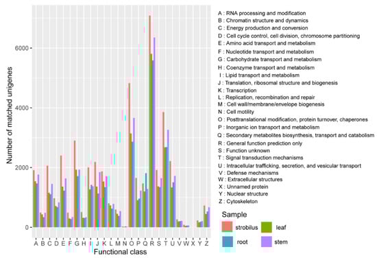 For more comprehensive annotation, all unigenes were searched against the KOG database. For the root, stem, leaf, and strobilus, 26,123 (58.19%), 31,452 (54.15%), 26,955 (53.39%), and 38,723 (57.25%) unigenes were classified into 26 KOG categories, respectively (Figure 3). Similar to the GO classification and KEGG pathways, the distribution patterns of KOG categories were generally similar among the four organs. The undefined functional “general function prediction only”, “posttranslational modification, protein turnover, chaperones”, and “signal transduction mechanisms” were the top three categories in all four organs. “Defense metabolites” is very important for the physiology and evolution of conifers, and 207, 216, 195, and 267 of the unigenes for the root, stem, leaf, and strobilus were clustered into this category.