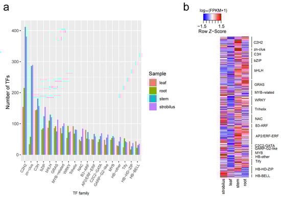 For the root, stem, leaf, and strobilus, we identified 1678, 2432, 1706, and 2497 TFs from 66 different families, using the iTAK pipeline (Table S9). The top 15 TF families identified in the four organs are shown in Figure 4a. Among them, C2H2, C3H, bHLH, and bZIP were the most commonly represented TF families in all four organs of P. chienii. We found 215, 412, 154, and 381 putative C2H2 TFs in the root, stem, leaf, and strobilus, an obviously highest number than that for other TF families, followed by C3H (145, 181, 143, and 157), bZIP (85, 124, 81, and 154), and bHLH (110, 129, 87, and 121). We further identified the DEGs of the top 15 TF families among the four organs. We found that most DEGs of C2H2, C3H, bHLH, and bZIP families had higher expression levels in the root and stem than those in the leaf and strobilus (Figure 4b). The identification of numerous TFs provides abundant resources for the further research of specific TFs under the various life processes and environmental stresses of P. chienii.