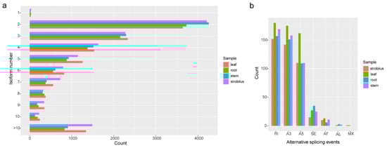 For the root, stem, leaf, and strobilus, 10,681, 11,556, 12,485, and 13,206 unique transcript models (UniTransModels) were captured, of which 99.71%, 99.81%, 99.79%, and 99.73% had more than one isoform. In total, 11.30% and 10.73% of the UniTransModels had more than 10 isoforms in the strobilus and leaf, and these percentages were lower (7.87% and 7.75%) for the stem and root (Figure 5a). We identified 461, 475, 559, and 430 AS events in root, stem, leaf, and strobilus covering 3888, 4178, 4035, and 4113 UniTransModels, respectively. Retained introns (RIs) were identified as the predominant AS event in all four organs, and we identified 157, 169, 180, and 152 (accounting for 34.06%, 35.58%, 32.20%, and 35.35%) RIs in the root, stem, leaf, and strobilus, respectively. The types of alternative 3′ splice sites (A3) (151, 158, 175, and 142 for the root, stem, leaf, and strobilus) and alternative 5′ splice sites (A5) (109, 110, 162, and 110 for the root, stem, leaf, and strobilus) were followed. Mutually exclusive exons (MX) and alternative last exons (AL) were the least frequent (Figure 5b).
