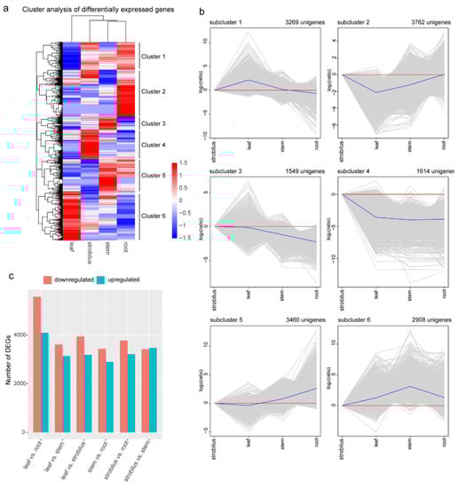Differentially expressed genes (DEGs) among four organs of P. chienii. (a) A heatmap of the expression patterns of 16,562 DEGs. A scale indicates the color assigned to log10(FPKM + 1). Red indicates high expression, and blue indicates low expression. (b) The six subclusters of the 16,562 DEGs were clustered. The number of unigenes in each subcluster is shown at the top of the subcluster. The red lines represent the gene expression level of the strobilus. The blue line shows the average values of the relative expression levels in each subcluster, and the gray lines represent the relative expression levels of each unigene. (c) The number of upregulated and downregulated unigenes for leaf vs. strobilus, leaf vs. root, leaf vs. stem, strobilus vs. root, strobilus vs. stem, and stem vs. root.